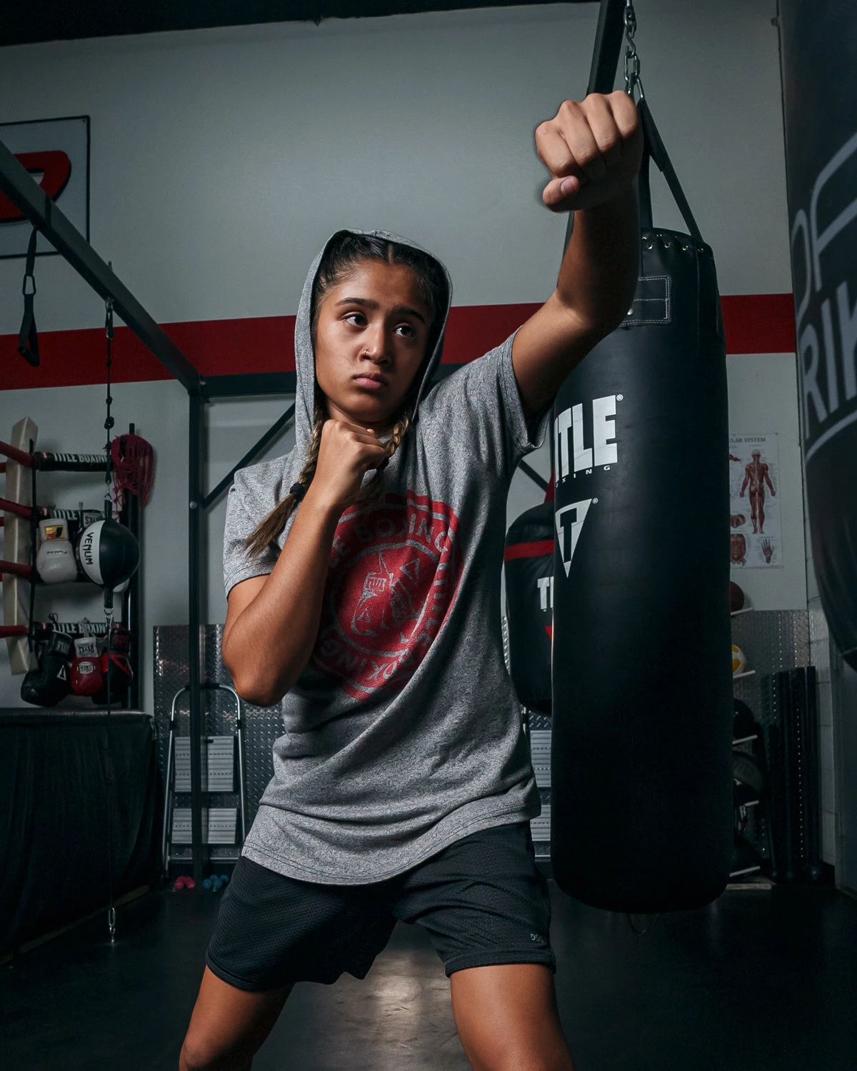 Short sleeved hooded tee built with a slightly relaxed athletic fit. Available in blue or grey with a vintage print. Comfortable and functional for the gym or home!